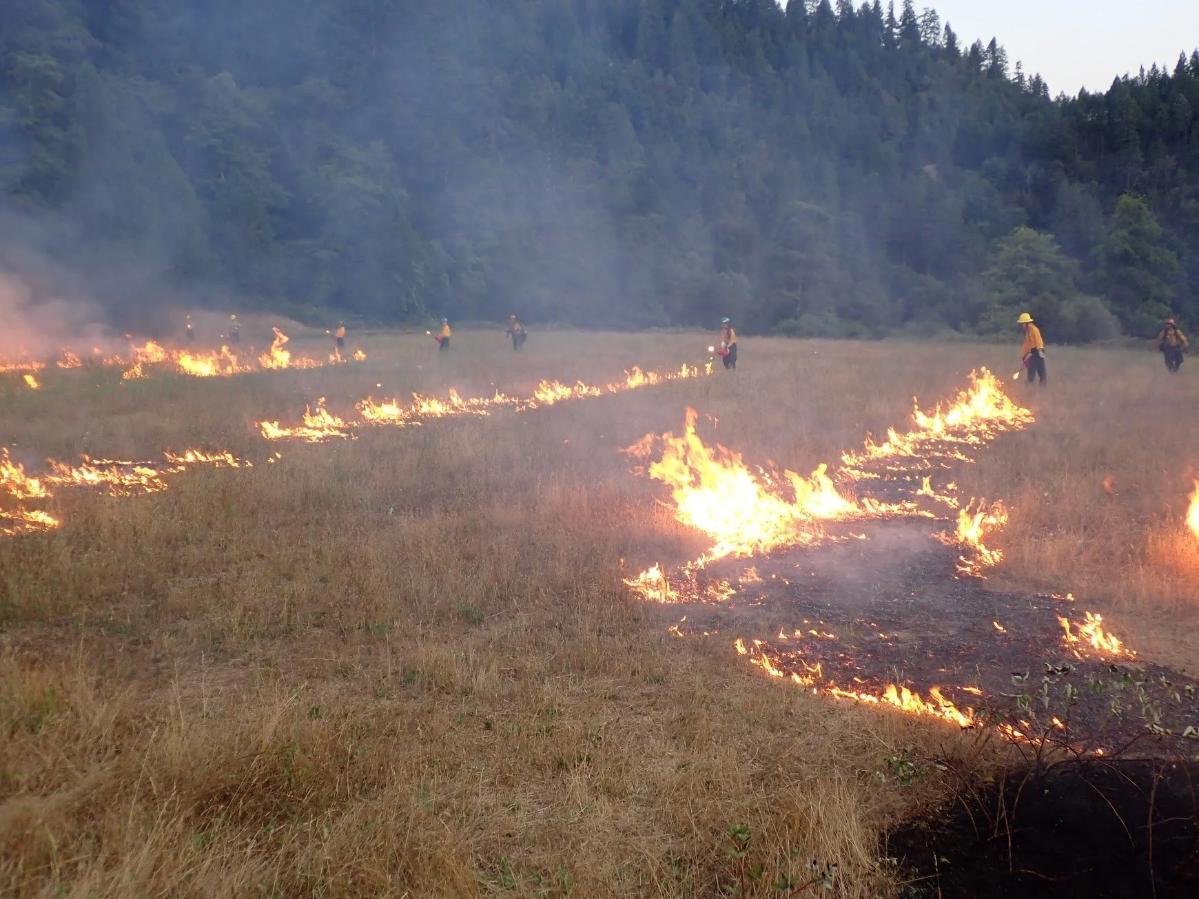 The internship started off with a blaze through participation in two prescribed fires during the second week of July. At Butler Flat on the Salmon River, interns used flaming pitch sticks, a traditional Indigenous fire lighting technique, to help treat the dry meadow with fire in collaboration with cultural practitioners. With the Butler Fire burning on the slopes above and a cultural burn happening at the adjacent property, this prescribed fire helped to safeguard the property by removing volatile fuel in a controlled manner and establishing a large safe zone adjacent to homes. Days later when the wildland fire did eventually reach the property, the meadow was an asset to firefighters and residents rather than a hazard. Two days later the interns were back at it at Blue Heron Ranch on the Klamath River where they spread out with drip torches and laid progressive lines of fire across the meadow during the cooling evening hours. Never before in past years have MKWC interns had the opportunity to actually put good fire on the ground. Interns expressed that working with fire in a hands-on way was exciting, empowering, and a highlight from the summer.